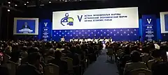 The Astana International Forum (AIF) is an international and regional platform for dialogue and a nonprofit organization headquartered in Astana, Kazakhstan. Previously called the Astana Economic Forum, it has been organized by the Government of Kazakhstan since 2008.[1][2] The name change reflects the broader range of topics discussed at the forum, such as climate, food and energy security and is intended to draw of attendees from around the world.[3] The Forum is organized by the Government of Kazakhstan, which includes the Economic Research Institute, Ministry of National Economy and Ministry of Foreign Affairs. A meeting is held each year in Astana in which more than eight thousand delegates from one hundred countries are brought together: they include chief executive officers, politicians, journalists, scientists and Nobel Prize laureates.[4] The 2024 Forum will be held on 13-14 June 2024, under the chairmanship of President Kassym-Jomart Tokayev.[5]