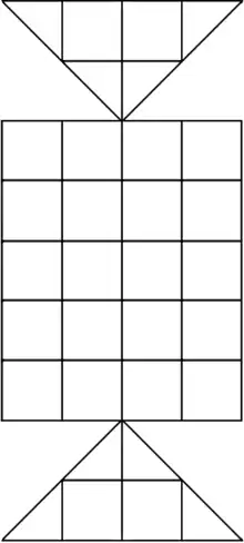 A 5x6 square grid is used with a triangular board attached on two opposite sides of the square grid specifically on the two shorter sides of the square grid. The square grid only consist of orthogonal lines; there are no diagonal lines.