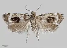 ♂. 10 mm. Head and thorax dark brown. Pace grey. Palpi, second segment with dense rounded descending tuft, grey. Antennae black spotted with white, ciliations in ♂ 3+1⁄4. Abdomen greyish fuscous. Legs dark fuscous, mixed and banded with white. Porewings with costa slightly arched, apex rounded, termen almost straight, oblique; brown; markings formed chiefly by dense white irroration; a small irregular basal patch; a broad band from 1⁄5 to 1⁄2 costa and 1⁄4 to 1⁄2 dorsum, its inner edge slightly incurved and its outer margin irregular; a broad fascia from costa at 3⁄4 to tornus, constricted beneath costa and somewhat excurved; a thin subterminal line white on costa and metallic blue round termen: between second and third fasciae on lower half of wing a large black blotch enclosing two small patches of metallic blue scales: fringes brown, touched with white at tornus and with a darker basal line. Hindwings pale purplish brown, lighter towards apex; a rather obscure white fascia from tornus reaching about half way round termen and keeping close to the margin: fringes brown, more or less white-tipped and with a darker basal line.[3]