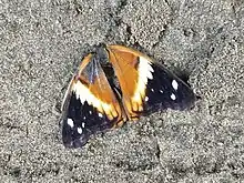 The upperside of the wings is brown in both sexes. The male forewing has white spots near the tip, and some yellow spots across the wing's center. The hindwing of the males has six dark eyespots that are submarginal. Females have much darker spots, which are more diffuse. Their forewing is not as hooked, and much broader than in males.[2]