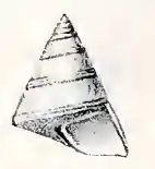 The spire is high and conical. The apex broken. The 8 whorls (reckoning the first two as broken) show a slow and regular increase till the last, which enlarges rapidly. They are perfectly flat, with an upper and lower border, sharply angulated and carinated at the periphery, slightly convex but still very flat on the base, with a blunted angulated and carinated umbilical edge. The suture is linear, almost invisible, marginated above and below. The aperture is perpendicular, rhomboidal, with the columella and basal edges nearly equal, and the columella and outer lip nearly parallel. The outer lip is sharp and thin, not patulous, not descending, advancing at its junction with the body whorl, then retreating so as to form the broad open sinus, acute angled at the periphery, slightly arched across the base, nicked close to the point of the pillar. The columellar lip is arched, strengthened by a thin pad; reverted on the umbilicus so as to leave a slight groove behind it, it has a slight tooth in front. From the body whorl it bends very much over to the left, so as largely to cover the umbilicus, and then it curves over to the right to join the outer lip on the base at an obtuse angle. The umbilicus is small, oblique edged, funnel-shaped, nearly covered by the columellar lip, contracted within, scored with hair-like lines of growth.[4]