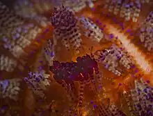 Several different organisms live in association with the Pacific fire urchin; these include the commensal shrimps Periclimenes colemani and Allopontonia brockii, and the parasitic snail Leutzenia asthenosomae, as well as the zebra crab, Zebrida adamsii.[1][5][6] Siphamia tubifer is one of several small fish that make use of the protection provided by the urchin's toxic spines, as do certain cephalopods.[2]
