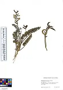 The inflorescence is covered in dark hairs and bears up to 45 flowers. Each flower is between one and two centimeters in length and has white petals tipped and streaked in bright purple. The fruit is a hanging legume pod up to 6.5 centimeters long. It is curved in shape and leathery and hairy in texture.