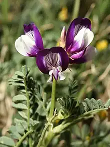 This is an annual herb which is variable in appearance, especially across varieties. It produces slender, hairy stems which reach 4 to 45 centimeters in length. The leaves are up to 6.5 centimeters long and are made up of several oval-shaped pointed or round-tipped leaflets. The inflorescence bears 1 to 4 white to purple or bicolored flowers, each less than a centimeter in length. The fruit is a legume pod 12 to 26 mm long.[1]