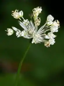 Astrantia carniolica reaches on average less than 45 centimetres (18 in) of height.[3] The stem is erect and glabrous, with little branches and few leaves. The basal leaves have a long petiole 10–20 centimetres (3.9–7.9 in), 3 to 7 lobes and toothed segments. Size: 8–15 centimetres (3.1–5.9 in). The cauline leaves are generally two, sessile, amplexicaul and lanceolate-shaped with a trilobed apex. The inflorescence is umbrella-shaped, with 2–3 centimetres (0.79–1.18 in) of diameter. The floral bracts are numerous (10 - 20), 10–18 millimetres (0.39–0.71 in) long, reddish (sometimes white) with acuminate apex. The small flowers are white. The central ones are hermaphrodite, while the external ones are male. The petals are white, while the stamens are five and much longer. Size of the flowers: about 1–2 mm. The flowering period extends from June through September.