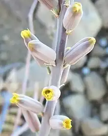 Astroloba tenax has curved, spreading leaves, which have a shiny surface, often with a variation of lines, spots or tubercles. It has extremely tall, thin inflorescences that are often branched. Each flower is tiny, gray and tubular, with a constricted yellow neck, and lobes which barely open. It is extremely variable in size and the moltenoi variety has the largest plants in the genus. Astroloba tenax is distinguished by its flowers and by the form of its glossy leaves.[2]
