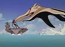 In the original intentions of the authors, the Angel who should have fought at sea against Unit 02 was Sachiel, an idea that was set aside and reused for Gaghiel, while Sachiel was then made to appear in the first episode.[20] The official filmbooks of the series noted that Gaghiel's battle with the battleships is realistically impossible; according to the filmbooks, however, Gainax could have ignored the realism of the clash in an attempt to seek the viewers' catharsis.[21] According to the original script, three battleships should have been used for the fight, but only two were used in the final version.[22] "Asuka Strikes!" also depicts existing military vehicles, such as the Sukhoi Su-33, the Yakovlev Yak-38,[23] the Northrop Grumman EA-6B Prowler, the Northrop Grumman E-2 Hawkeye, and the Mil Mi-2,[24][25] along with a Mil MI-55D, a helicopter that does not exist in the real world designed for the episode.[26][27]