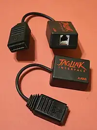 The redesigned second controller, the ProController by Atari, added three more face buttons and two triggers.[55] It was created in response to the criticism of the original controller, said to lack enough buttons for fighting games in particular. Sold independently, however, it was never bundled with the system. The Team Tap multitap adds 4-controller support, compatible only with the optionally bundled White Men Can't Jump[56] and NBA Jam Tournament Edition.[57] Eight player gameplay with two Team Taps is possible[56] but unsupported by those games.[55] For LAN multiplayer support, the Jaglink Interface links two Jaguar consoles[55] through a modular extension and a UTP phone cable. It is compatible with three games: AirCars, BattleSphere, and Doom.