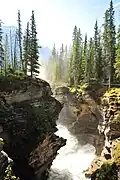 Athabasca Falls is a Class 5 waterfall, with a total drop height of 24 m (79 ft) and a width of 46 m (151 ft).[1] A powerful, picturesque waterfall, Athabasca Falls is not known so much for its height as for its force, due to the large quantity of water falling into the gorge, which can be substantial even on a cold morning in the fall, when river levels tend to be at their lowest. The river falls over a layer of hard quartzite and through the softer limestone below, carving a short gorge and a number of potholes.[2]