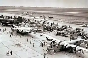 ![]() Open house at Atlanta Army Air Field, 1945, after V-J Day. Shown are a B-24 Liberator, B-17 Flying Fortress, various trainers, a C-46 Commando, and other unidentified aircraft | |