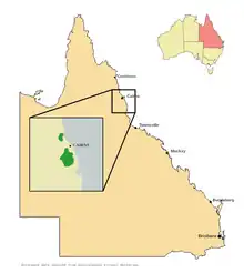 Merikin grows in well developed rainforest from Mt Spurgeon (source of the Mossman River), to the Tully River, at altitudes from around 80 m (260 ft) to 1,300 m (4,300 ft).[4][5]