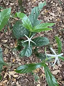 The inflorescences may consist of panicles, fascicles or solitary flowers, and are produced in the leaf axils.[5] The white fragrant flowers have 5 petals and measure about 50 mm (2.0 in) diameter.[5] The calyx lobes are about 1 mm (0.039 in) long, the corolla tube about 15–20 mm (0.59–0.79 in) long.[4]