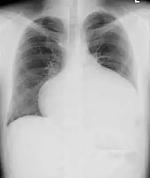 Adults with an uncorrected ASD present with symptoms of dyspnea on exertion (shortness of breath with minimal exercise), congestive heart failure, or cerebrovascular accident (stroke). They may be noted on routine testing to have an abnormal chest X-ray or an abnormal ECG and may have atrial fibrillation. If the ASD causes a left-to-right shunt, the pulmonary vasculature in both lungs may appear dilated on chest X-ray, due to the increase in pulmonary blood flow.[33]