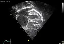 Ultrasound picture of the heart, seen in a subcostal view: The apex is towards the right, the atria are to the left. ASD secundum seen as a discontinuation of the white band of the atrial septum. The enlarged right atrium is below. The enlarged pulmonary veins are seen entering the left atrium above.