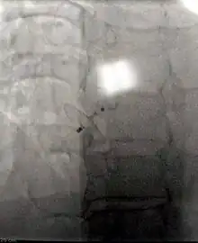 Percutaneous device closure involves the passage of a catheter into the heart through the femoral vein guided by fluoroscopy and echocardiography.[13] An example of a percutaneous device is a device which has discs that can expand to a variety of diameters at the end of the catheter. The catheter is placed in the right femoral vein and guided into the right atrium. The catheter is guided through the atrial septal wall and one disc (left atrial) is opened and pulled into place. Once this occurs, the other disc (right atrial) is opened in place and the device is inserted into the septal wall. This type of PFO closure is more effective than drug or other medical therapies for decreasing the risk of future thromboembolism.[13][47][48] The most common adverse effect of PFO device closure is new-onset atrial fibrillation.[49] Other complications, all rare, include device migration, erosion and embolization and device thrombosis or formation of an inflammatory mass with risk for recurrent ischemic stroke.[50][51]