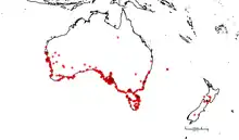 The distribution is highly coastal. As a result, > 95% of recorded occurrences in Australia are on the coast (according to Atlas of Living Australia). It is found in Western Australia, South Australia, Victoria, Tasmania and NSW. Established on coastal sandy soils, specifically preferring bays and inlets such as Western Port Bay and Port Phillip Bay. The natural range and density of this species has decreased as major cities (Melbourne/Sydney/Adelaide) and subsequent suburbs have expanded along the coast of Australia. The distribution extends to the Bass Strait Islands and Tasmanian coastline. The presence of A. cinerea on these islands may suggest this species had a wider distribution in times of lower sea levels.