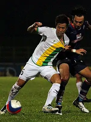 ![]() Atsushi Shimono (in white) turning out for Woodlands Wellington and tussling for the ball with Warriors F.C. marquee signing, Kazuyuki Toda (in dark blue), during a S.League match on February 21, 2013. | |||