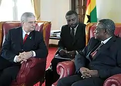 Mills' main opponent from the New Patriotic Party was now Nana Akufo-Addo. Mills ran under the campaign slogan of "A Better Man for a Better Ghana," on a platform of change. He said: "People are complaining. They're saying that their standard of living has deteriorated these past eight years. So if Ghana is a model of growth, it's not translating into something people can feel."[9] The result of the first ballot had Akufo-Addo in front with 49.13% of the vote to Mills' 47.92%, however, a run-off second round of voting was needed. The second round of voting took place on 28 December 2008. The result was a slim lead held by Mills, but due to problems with the distribution of ballots, the Tain constituency, located in the Brong-Ahafo Region, was forced to vote again on 2 January 2009. The final result was a victory by Mills with 50.23% of the vote to Akufo-Addo's 49.77%. Mills became the third president of the 4th Republic of Ghana.[1] Self-described as a social democrat who believed in the concept of social welfare espoused by Kwame Nkrumah (independent Ghana's first leader), Mills embraced a political platform that was more comprehensive and less divisive than that of either Nkrumah or Rawlings. John Atta Mills was sworn in as president on 7 January 2009 in a peaceful transition after Akufo-Addo was narrowly defeated.[18] His persistence and determination paid off when he won the 2008 presidential poll.[14]