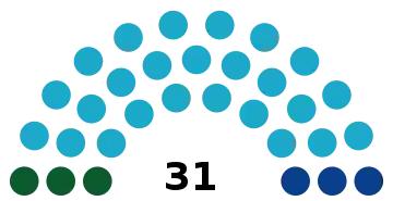 For the first time in 2021, 31 members of the Regional Mäslihat were elected on basis of party-list proportional representation. From there, the Nur Otan took an overwhelming majority of 25 seats, following by Ak Zhol Democratic Party (AJ) and Auyl People's Democratic Patriotic Party (AUYL) whom each won three seats.[3]