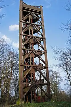 Atzelberg Tower (German: Atzelberg Turm "Atzel Mountain Tower"), also known as Atzelberg Observation Tower for long, was a 30.39 m-high (99.7 ft) German wooden lattice observation tower that was located on the summit of the 506.7 m-high (1,662 ft) mountain of Atzelberg.[2][3] The Atzelberg Tower had a floor count of 6 floors including both the ground floor and the top. The Atzelberg Tower's top floor measured 30.39 m (99.7 ft) above sea level. The tower also had a roof which measured 31 m (102 ft) from the ground.[2][3] The observation tower's top floor can only be reached through its 150-stepped staircases.[2] The tower was used from the year of its construction, 1980, until 5 August 2008, when it was ravaged by fire that was caused by arson, as an observation tower on the top of the Atzelberg, which provided viewers and/or observers a good view of the surrounding areas.[1][2][3]