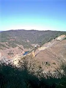 The demand for irrigation water in the Sacramento area and other parts of the Central Valley were also growing. In 1854, a diversion dam was constructed on the North Fork American River at the site of Auburn Dam, to divert water into ditches that supplied downstream farms. Irrigation with dam and canal systems was favored because the seasonal nature of the American River caused floods in some years and droughts in others.[10] A large dam at the Auburn site was thus considered for both flood control and water supply. In the 1950s, the Bureau of Reclamation created the first plans for a high dam at Auburn. Several designs, ranging from earth-fill to concrete gravity dams, were considered. Before the dam could be built, the Auburn-Foresthill Road – which crosses the river just upstream of the dam site – had to be relocated. Even before the project was authorized, contracts were let for the construction of a high bridge to carry the road over the proposed reservoir, as well as preliminary excavations at the dam site.[3]