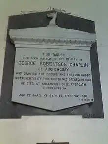 It has a small church whose architect was Frederick Thomas Pilkington (1832–98), the ground given by George Robertson Chaplin (proprietor) of Colliston House, Arbroath, the uncle of David Souter Robertson of Lawhead House nearby, and Murlingden House. The church has two stained glass rose windows, one of which has a spelling error in "Haleluya," though correctly spelled in the original transliteration of the Hebrew הללויה. White marble memorial stones to GRC and DSR, erected by their tenants, are on the back wall.