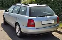 The first generation Audi A4 (known internally as the Typ 8D) debuted in October 1994,[4][5] with production starting November 1994 and European sales commencing in January 1995 for the 1995 model year. North American sales later began in September 1995 for the 1996 model year.[6] It was built on the Volkswagen Group B5 (PL45) platform, which it shared with the fourth generation Volkswagen Passat (B5, Typ 3B). It had a front-mounted longitudinal engine and front-wheel drive. Many variations of the A4 were also available with Audi's quattro four-wheel drive system. The A4 was initially introduced as a four-door saloon/sedan; the Avant (estate/wagon) was introduced in November 1995 and went on sale in February 1996.