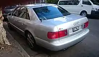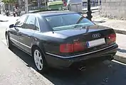 Audi S8 (D2) was produced from 1996 to 2003. The car featured a 4.2 liter V8 with 340 PS (250 kW; 335 hp). The D2 S8 could accelerate from 0–60 mph (97 km/h) in 6.2 seconds. It has a curb weight of 1,730 kg (3,814 lb). In 1999, the car was updated with a power increase to 369 PS (271 kW; 364 hp), which brought the 0–60 mph (97 km/h) acceleration down to 5.6 seconds. Top speed was electronically limited to 155 mph (249 km/h). It has a curb weight of 1,845 kg (4,068 lb).[1] An Audi S8 (D2) was chosen as the car of the protagonists of the film Ronin.[2]