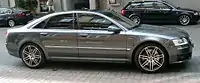 The Audi S8 is a full-size luxury car of the Audi S models produced by the German automaker Audi AG, manufactured by Audi Sport GmbH at the Neckarsulm plant. The S8 is the mechanically-upgraded, high-performance version of the Audi A8, fitted standard with Audi's quattro all-wheel drive system, and was only offered with a short-wheelbase for the first three generations, being joined by a long-wheelbase variant option for the fourth generation.