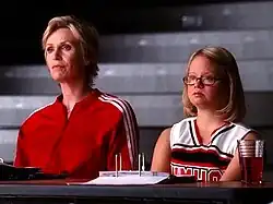 As of "Audition", formerly recurring cast members Heather Morris and Naya Rivera were promoted to series regulars as cheerleaders and glee club members Brittany Pierce and Santana Lopez respectively.[6] The episode introduced four new cast members. Chord Overstreet plays Sam Evans, a recurring character who is initially an athletic protégé of glee club member Finn, but becomes his rival.[7] Jake Zyrus appears as Sunshine Corazon, a foreign exchange student and rival to Rachel.[8] Zyrus was a fan of the show during its first season, and had his manager approach Murphy about casting her in season two.[9] Dot-Marie Jones was cast as football coach Shannon Beiste,[10] replacing season one cast member Patrick Gallagher as Ken Tanaka.[11] Cheyenne Jackson appears as Dustin Goolsby, the new director of rival glee club Vocal Adrenaline, replacing Shelby Corcoran (Idina Menzel). Jackson was originally considered for the role of Will,[12] and in 2009 was cast in the Glee episode "Acafellas" as Vocal Adrenaline choreographer Dakota Stanley, but he was unable to perform due to illness.[13] Murphy described Dustin as "a complete villain", and stated that he would "become very intertwined in Will's life".[14]