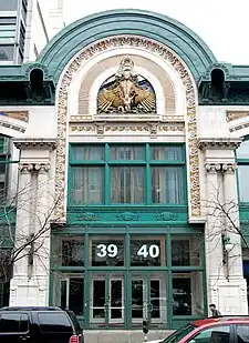 Architect Thomas Lamb, who later would design the nearby eclectic United Palace, was an advocate of the use of ornamentation and color on his building's exteriors. He would write: "Exotic ornaments, colors and scenes are particularly effective in creating an atmosphere in which the mind is free to frolic and becomes receptive to entertainment."[11] In line with this philosophy, the facade of the Audubon Ballroom presents terra-cotta glazed polychromy, encrustations and cornices.[12] Its ornamentations include brown foxes between the windows on the second floor, intended to flatter Fox,[4] and, most prominently, a colorful protruding three-dimensional statue of Neptune on a ship.[2]