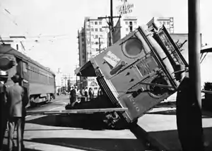 A streetcar is overturned during a strike among streetcar workers in Los Angeles.
