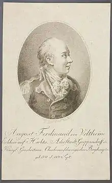 August Ferdinand von Veltheim (18 September 1741 Harbke – 2 October 1801. Braunschweig) [1] was a German mineralogist and geologist, and came from the aristocratic family of Veltheim. He was known as August Ferdinand Graf von Veltheim from 1798 after acquiring the title of 'Graf'.[2]