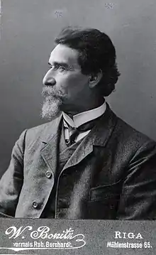 Throughout his studies, Volz had been working at different workshops. In October 1871, Volz ceased his studies at the academy and began to work full-time for the firm Ende & Böckmann. The firm also took on commissions abroad, and it was through Ende & Böckmann that Volz came to Riga in the autumn of 1875 to work on the sculptural decoration of a large tenement house (on the present-day address Krišjāņa Barona iela 12). Already on 2 January 1876 he established his own firm in Riga.[2] Riga had at that time a large Baltic German population.[3] In addition to his own work as a sculptor, Volz taught at the Art Academy of Riga after its establishment in 1906.[4][1]
