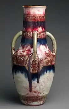 Initially he made stoneware pieces in several versions, and did not do the throwing himself, giving drawings to assistants. His pieces were almost all vases of one sort or another. He preferred relatively simple basic shapes, often augmented with bold ribs or handles, concentrating on the surface effects, especially high-temperature "flambé" glazes. His work came to the notice of other potters at the exhibition held by the Union Centrale des Arts Décoratifs in 1887, and then won prizes at the Paris Exposition Universelle of 1889.[4] He won gold medals at both, and the Exposition Universelle of 1900, again in Paris.[5]