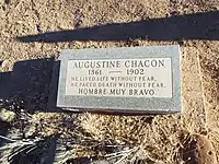 Augustine Chacon was known to have fathered at least one child in his lifetime, a son, and his descendants still live today. In 1980, some of Chacon's family members dedicated a marble gravestone at the San Jose Cemetery, which holds his remains.[18] Chacon's gravestone says the following: