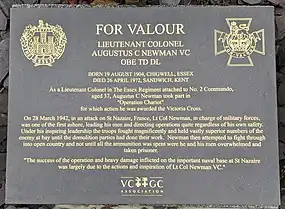 On 28 March 1942 in the attack on St. Nazaire, France, Lieutenant Colonel Newman was in charge of the military forces and he was one of the first ashore, leading his men and directing operations quite regardless of his own safety. Under his inspiring leadership the troops fought magnificently and held vastly superior numbers of the enemy at bay until the demolition parties had done their work. The colonel then attempted to fight through into open country and not until all the ammunition was spent were he and his men overwhelmed and taken prisoner.[2]