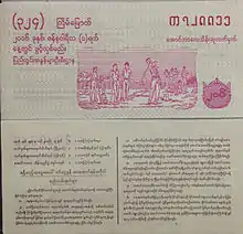Aungbazay (Burmese: အောင်ဘာစေ; also spelt Aung Bar Zay, lit. "may you win") is Myanmar's official state lottery. The monthly lottery is administered by the Ministry of Finance's State Lottery Department.[1][2] Lottery tickets are printed at a printing plant in Wazi, Magwe Region, at the same location where Burmese kyat notes and passports are printed.[3][4]