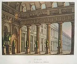 Aureliano in Palmira was Rossini's second commission from La Scala. It opened the theatre's Carnival season with the famed castrato, Giovanni Battista Velluti as Arsace. It was the only role that Rossini wrote for the castrato voice. Rossini had originally written the role of Aureliano for Giovanni David, one of the most renowned tenors of the day. However, throat problems during rehearsals led David to withdraw from the production, and Luigi Mari took his place.[6] The popular soprano, Lorenza Correa, sang the role of Queen Zenobia. The orchestra at the premiere was conducted by Alessandro Rolla, with the staging directed by Alessandro Sanquirico.[7]
