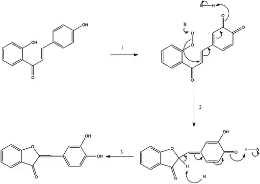 While the protein is named for the yellow aureusidin pigment it often produces, it may produce a number of similar aurones including sulfuretin, bracteatin, and 3',4',5',6-tetrahydroxyaurone. In order to modify the chalcone to an aurone, the chalcone must undergo an oxidative cyclization to form a five-member heterocycle fused to the a-ring of the aurone. This step may not proceed unless the 3-position on the chalcone's B-ring is oxygenated. From this and the protein's homology with PPO, the current proposed mechanism for aureusidin synthase is shown in Fig. 2. The first step in the process results in a hydroxylation in the 3 position (for THC) and an oxidation to a diketone ring. This mechanism is generally assumed to be the same as that of tyrosinase.[9] This assumption is based on the homology of the two structures and similar functionality. This product then undergoes an oxidative cyclization and then an isomerization to give the final product, but it is possible that these steps take place outside the enzyme.[2] This mechanism can only produce aurones with 3',4'-dihydroxy or 3',4',5'-trihydroxy functionalization, but there have been aurones reported with one or no hydroxyl groups on the B-ring. It is unclear whether this aurone formation is due to an alternative mechanism or another protein.[10]