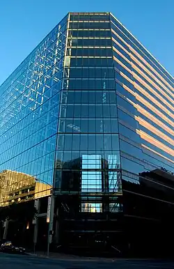 The ground was broken for the Austin Centre in August 1984; the land once contained the home of Mirabeau B. Lamar, although the house burned down in 1847.[1] To accommodate the 700-space underground parking garage, builders had to drill through a solid chunk of limestone and "quarry" their way 55 feet to the bottom. The building opened in September 1986; the opening was marked with a series of lavish parties and an all-expense-paid tour for 35 writers from various trade publications.[2] Upon its opening, the building touted innovative technological features such as computerized communications, energy management, and its very own on-site telephone company called "EntelCom".[2] In 1988, a chemical reaction in the exterior glass paneling caused panes to break and fall to the street below, prompting a $2 million replacement.[3]