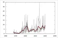 In 2017, the Kenyan rose industry broke through to the Australian market on a large scale with 5.22 million rose stems being imported in the lead up to Valentine's Day.[20] This number increased to 6.46 million imported rose stems from Kenya in 2018 which accounted for over 60% of Australia's imported rose stems in the lead up to Valentine's Day.[20][21] Kenyan flower exports began competing with Australian growers until 2018 when Australia introduced new bio-security measures to reduce the number of pests in imported flowers which Kenya are yet to comply with.[22] Australia extended the deadline for countries to comply with these new measures three times and the Australian Department of Agriculture announced in 2019 that there would be no further extension.[21] The Australian market is an important diversifier for the Kenyan flower industry as Clement Tulezi, Kenyan Flower Council chief executive said in 2019, "Australia is a growing market with huge potential and we cannot afford to lose it if we are to succeed in diversification."[23]