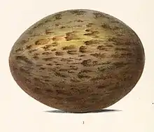 Ardeotis australis does not make any attempt to construct a nest. The clutch size is usually one egg, sometimes two, laid close to a small shrub or bush on unadorned ground. The shell is marked with olive-brown blotching and streaks over most of the surface, perhaps more completely covering the larger end of the egg, the background colour is a lighter shade of olive-brown or olive-green. Incubation of the brood is maintained by the female. The dimensions of the egg are 75 × 55 millimetres. The chick will leave the site after emerging from its shell to avoid predation, and relies on the mottled black and brown coloration of their downy plumage to evade detection by squatting and remaining motionless.[8]