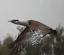 The largest male recorded was 14.5 kg (32 lb),[15] a specimen obtained in Victoria. Reports of large birds, presumably males, were given by Tom Carter in the west (16 lb), a recorded range of 16–18 lb by E. F. Boehm in South Australia was exceeded in some specimens (28 lb). The smaller specimens in records are of an unwell adult weighing 9 lb, shot by Carter at Broomehill, and a healthy but small specimen of 7½ lb captured and weighed by Dominic Serventy and Hubert Whittell at Bridgetown in 1949.[8] Although it is the largest extant flying land bird in Australia, this long-legged bird is the smallest species in the genus Ardeotis.[15]