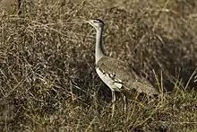 The Australian bustard (Ardeotis australis) is a large ground-dwelling bird that is common in grassland, woodland and open agricultural country across northern Australia and southern New Guinea. It stands at about one metre (3 ft 3 in) high, and its wingspan is around twice that length. The species is nomadic, flying to areas when food becomes plentiful, and capable of travelling long distances. They were once widespread and common to the open plains of Australia, but became rare in regions that were populated by Europeans during the colonisation of Australia. The bustard is omnivorous, mostly consuming the fruit or seed of plants, but also eating invertebrates such as crickets, grasshoppers, smaller mammals, birds and reptiles.