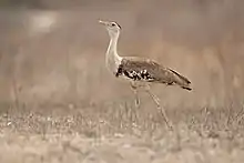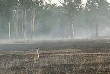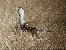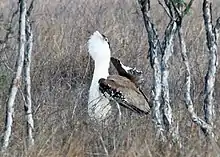 Greater numbers of the bird are seen during the breeding season.[16] The habits of the bird are usually discreet and shy of disturbance, however, the display of males during the breeding season is a conspicuous performance that is accompanied by loud booming. The male is able to expand a sac at the neck to display their longer feathers as a swaying skirt, with the head held proud and upward facing, the wings are pointed toward the ground and tail feathers arched over the back; they stride about an area while adopting this posture and emit deep roaring noises.[10] The voice of the courting male has been transliterated as "who-o-o-o".[8] Males have been observed in close proximity during territorial disputes, using the breeding display and call to challenge each other, but the direct conflict seen in smaller bustard species is rare with this bird. One incident involving physical combat at a height around 25 metres was recorded in Arnhemland, after a period of posturing and chasing by the males in dispute, but this may be unusual behaviour due to the greater risk of injury in this larger species of bustard.[17]