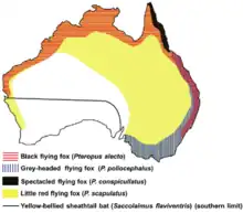 Bats, both flying foxes and insectivorous bats, are the only known host reservoir for ABLV. The known species of bat reservoirs are the Black Flying Fox (Pteropus alecto), the Grey-headed Flying Fox (P. poliocephalus), the Spectacled Flying Fox (P. conscpicullatus), the Little Red Flying Fox (P. scapulatus), and the Yellow-bellied Sheathtail Bat (Saccolaimus flaviventris).[5] These species are distributed throughout the Australian continent, and ABLV has only been serologically and phylogenetically in Australia.[7]:251 It is estimated that less than 1% of healthy bats are ABLV carriers. As for sick or injured bats, it is estimated that 5-10% have been infected, detected with fluorescent antibody testing.[5]