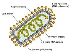 Viral Structure of a Lyssavirus Particle - with the five viral proteins and genome labeled.