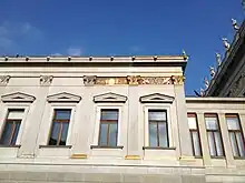 The group of figures in the gable are made of Laas marble and depict the allegorical times of the day. The columns and pilasters of the wall are made of marble from Untersberg, the stylobates of dark marble, the decorations of the doors of red Salzburg marble. The wall space between the pillars is made of grey scagliola, with niches in between decorated with statues made of Carrara marble. The statues show historical persons such as Numa Pompilius, Cincinnatus, Quintus Fabius Maximus, Cato the Elder, Gaius Gracchus, Cicero, Manlius Torquatus, Augustus, Seneca the Younger and Constantine the Great.[1] The friezes above were painted by August Eisenmenger and depict the history of the emergence of civic life. Starting from left to right it shows: