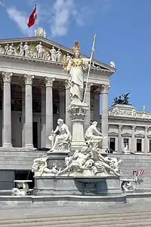 The Athena Fountain (Pallas-Athene-Brunnen) in front of the Parliament was erected between 1893 and 1902 by Carl Kundmann, Josef Tautenhayn and Hugo Haerdtl, based on plans by Baron von Hansen. In the middle is a water basin and a richly decorated base. The four figures lying at the foot of Athena are allegorical representations of the four most important rivers of the Austro-Hungarian Empire. They represent at the front the Danube and Inn, in the back the Elbe and Vltava (German: Moldau) rivers. On the sides little cupids ride dolphins. The statues of the Danube, Inn, and the cupids were executed by Haerdtl, those of the Elbe and Moldau by Kundmann. The female statues above represent the legislative and executive powers of the state and were executed by Tautenhayn. They are again dominated by the Goddess of Wisdom, Athena, standing on a pillar. Athena is dressed in armour with a gilded helmet, her left hand carries a spear, her right carries Nike.